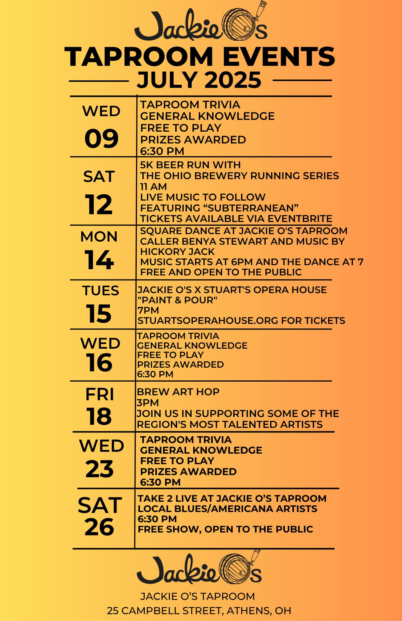 Join us at our Athens Taproom, 25 Campbell Street, in July for all types of events! There will be music, trivia nights, Paint & Pour, and more!