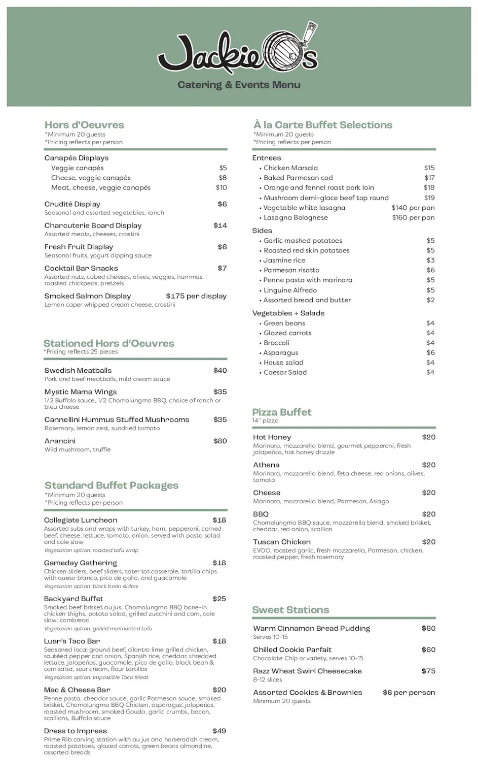 Whether you’re hosting an intimate gathering, corporate function, holiday party, or wedding, our dedicated team specializes in accommodating parties of all sizes with exceptional service and a diverse menu that delights every palate. Our commitment to quality ingredients and creative presentation guarantees that each dish not only tastes incredible but also adds a touch of elegance to your occasion. Let us handle the details while you enjoy a seamless celebration. Jackie O’s is your partner in making every event extraordinary!
