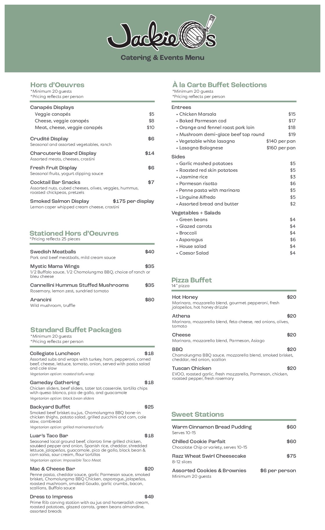 Whether you’re hosting an intimate gathering, corporate function, holiday party, or wedding, our dedicated team specializes in accommodating parties of all sizes with exceptional service and a diverse menu that delights every palate. Our commitment to quality ingredients and creative presentation guarantees that each dish not only tastes incredible but also adds a touch of elegance to your occasion. Let us handle the details while you enjoy a seamless celebration. Jackie O’s is your partner in making every event extraordinary!